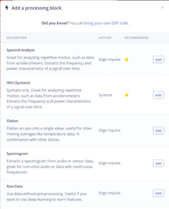 The next decision of the workflow is the application of various “processing blocks.” The job of the processing block is to pre-process and extract features from the raw data that will be used to teach the model. Edge Impulse conveniently provides a library of predefined digital signal processing blocks for different applications. The most common of these include: